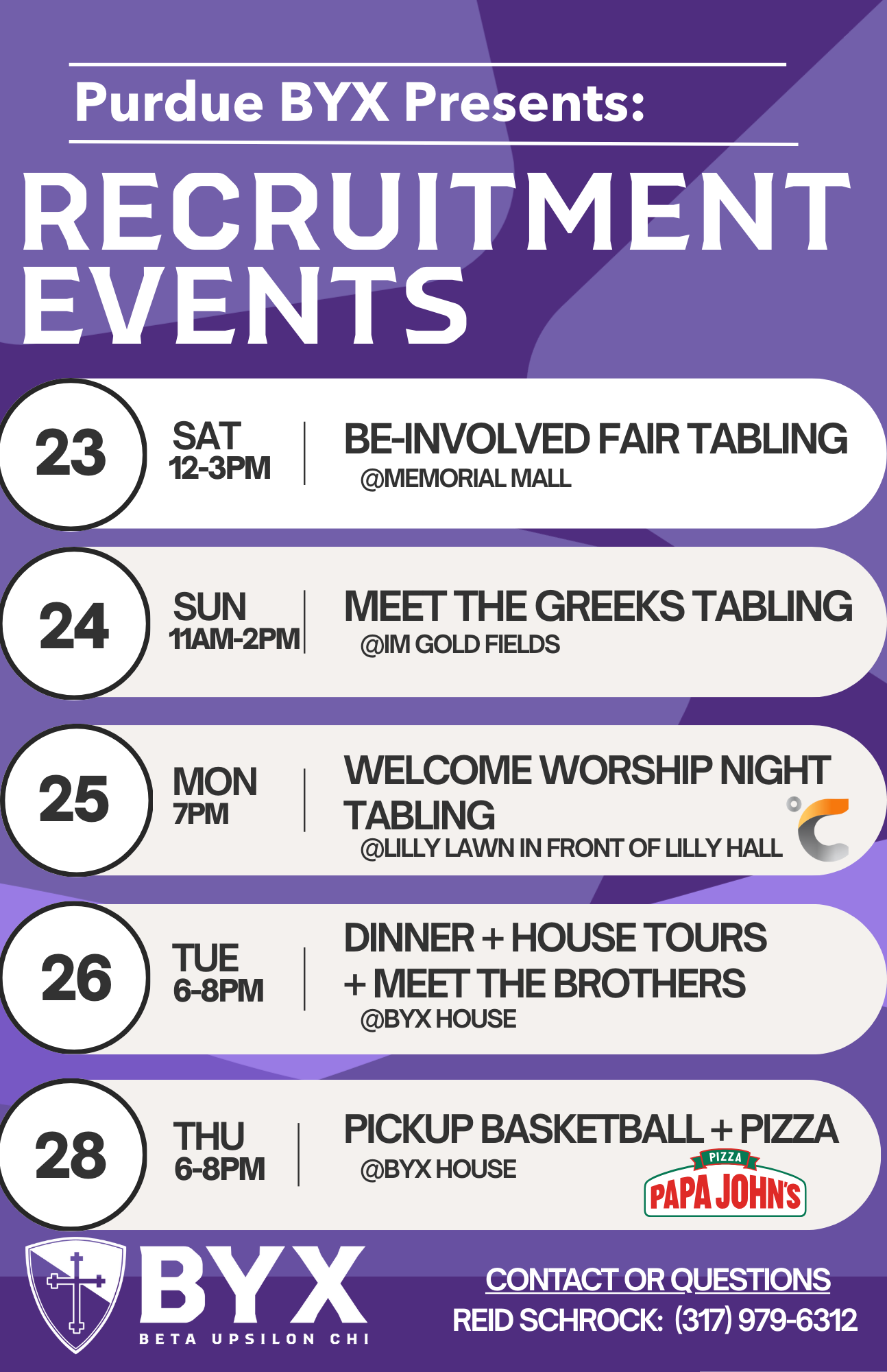 BYX is a national fraternity that seeks to foster brotherhood and unity in Christ. Everything we do as a fraternity is centered on building faithful men of God who will spread the name of Jesus wherever we go. College is a training ground for the lives ahead of us, and we strive to steward this time well by pursuing the Lord and engaging with the community around us. If you’re interested in joining BYX, our next opportunity to rush will be in January 2026. Until then, we have some recruitment events the first week of the 25-26 school year august 23-28th (posted on right) and or we would love to connect with you! Join us at our house for open worship nights every Wednesday of the school year at 8PM, enjoy dinner with us any night of the week, or grab a coffee with someone from our recruitment team. Feel free to scan the QR code above and fill out the Rush Interest Form—we’ll be in touch! You can also contact our Recruitment Coordinator, Reid Schrock, for more information at (317) 979-6312.